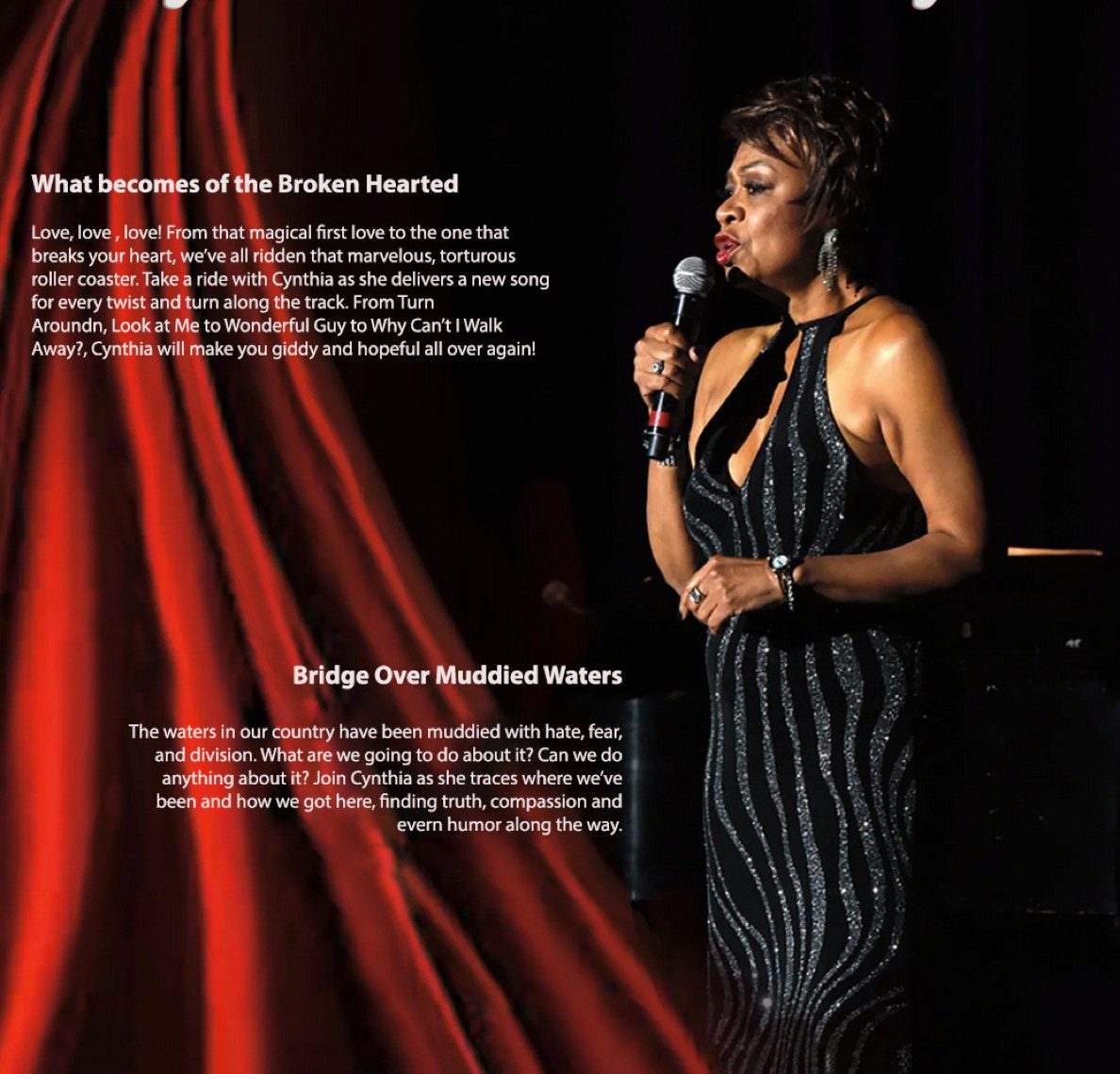 "It is clear that Cynthia Clarey’s intent in presenting Bridge Over Muddied Waters is to inspire thought and discussion about the disharmony that has become the norm in America. She not only brings her classically trained rich alto chops, she brings generous helpings of heart. She is also a smart enough entertainer to offer an engaging show rather than a diatribe on unkind behaviors."